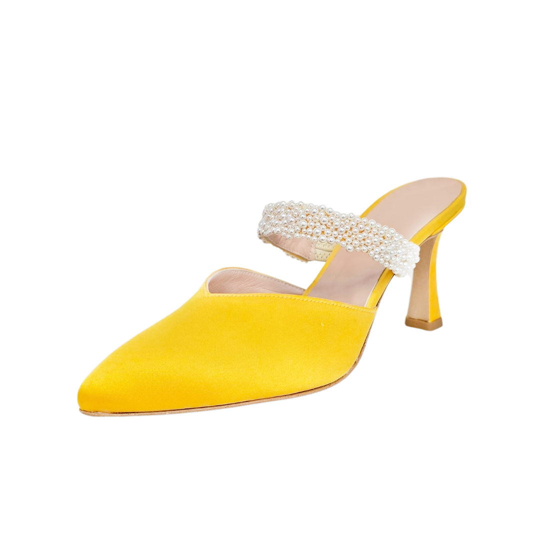 Scarpe a punta in raso giallo e perle made in italy